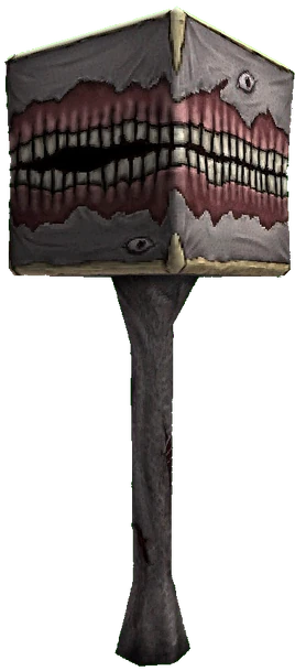 The Flesh Panopticon is a massive right rhombohedron (aka cube) rotating slowly on top of a flesh stalk, which leads into the base of the cube, whose sides are composed of pallid gray skin reinforced with human bone. It is also from this skeletal structure that the Panopticon's "face" is splayed across. Like its predecessor, its mouth is capable of moving, but rather than screaming when it performs an attack, its teeth are constantly chattering in a rippling pattern that moves counter to the direction it is rotating.