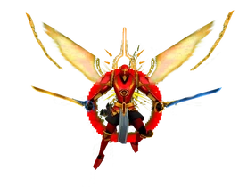 Gabriel is depicted wearing silver armor with golden accents, and his eyeless helmet is embedded with a golden cross. Sky-blue light constructs form both his angel wings and his halo. He also wears ornate twin swords sheathed on his right hip, the scabbards bearing the phrases "Splendor is Justice" and "Justice is Splendor". Unlike his first encounter, Gabriel will use these swords extensively during this fight. During his first phase, Gabriel starts off Enraged with aggressive red colors, before calming down and reverting to his regular color scheme during his second phase.