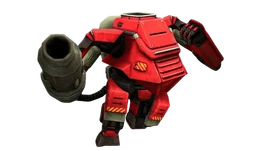 Guttertanks are bulky, humanoid machines with bright red armor, bearing a strong resemblance to WW2 era German tanks. They have horse-like legs with square-shaped metal "hooves" that help prevent the machine from getting stuck in patches of mud on the battlefield. On their right forearm is a large rocket launcher, which is connected to a white steaming tank mounted on their back, presumably used in the process of synthesizing ammunition. Meanwhile, their left arm is more human-like, with only three fingers and a thumb, which is used for punching and placing landmines.