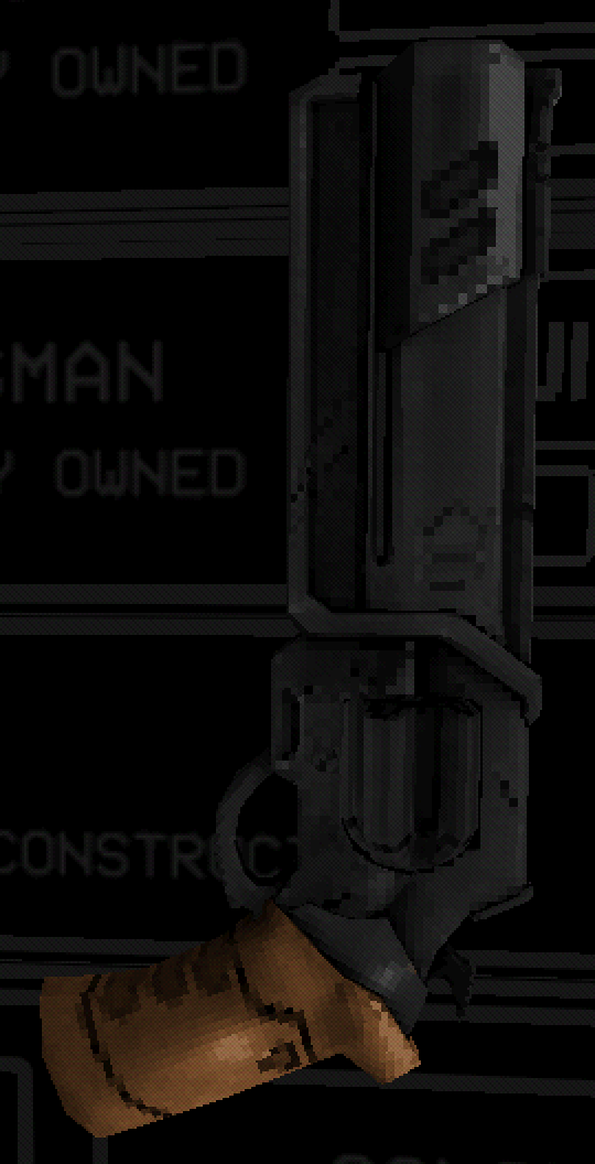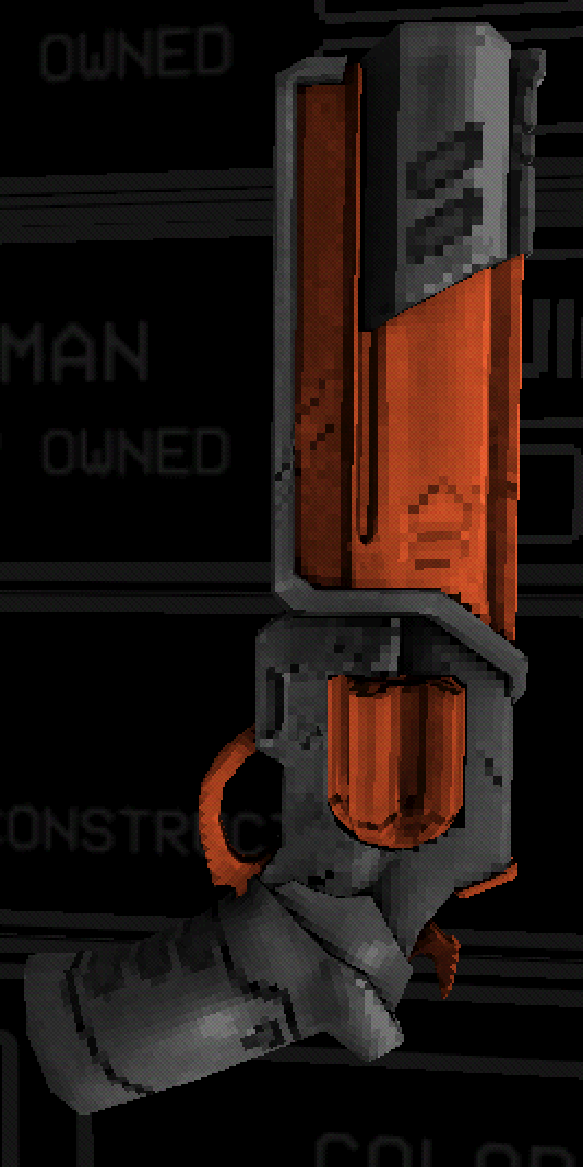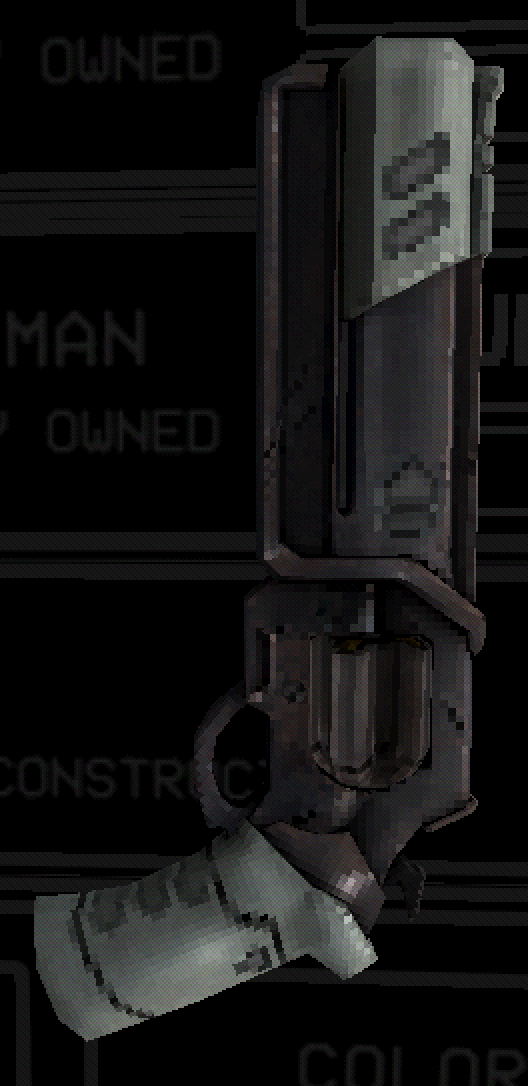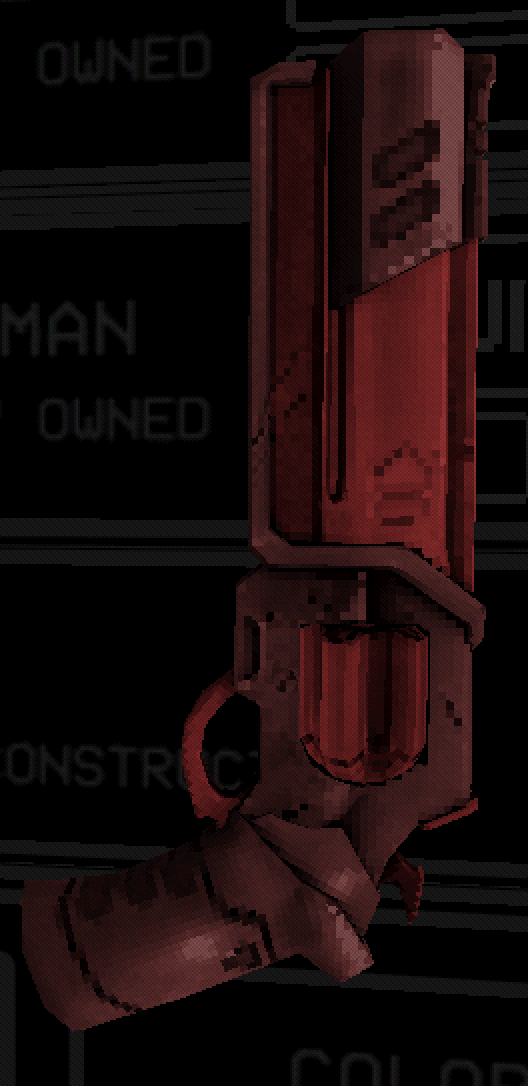 The Revolver is the first base weapon acquired in ULTRAKILL, taken off a pedestal at the beginning of [ 0-1: INTO THE FIRE ]. It resembles a conventional revolver with sci-fi accoutrements: above the grip there appears to be a battery with a cable connecting it to the on-board display, and in place of a conventional muzzle there is a tall, glowing rectangular opening. Its cylinder has six chambers that glow the color of the current variant.