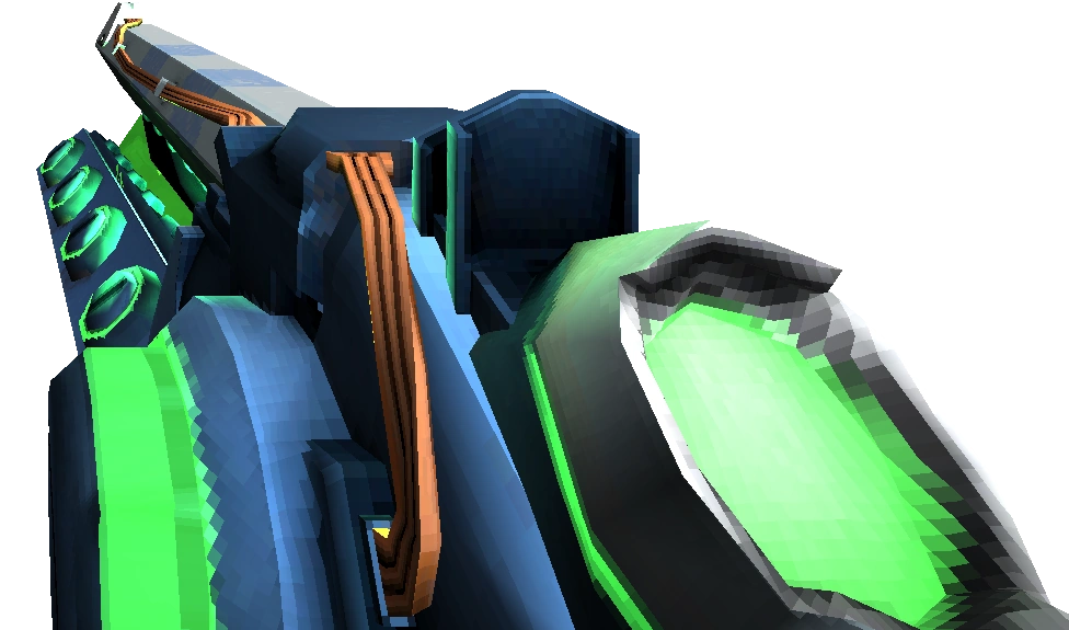 The Screwdriver Railcannon is a large green, silver and light-blue gun that, as its name suggests, resembles a hybrid between a railgun and a cannon. Three yellow-orange wires run from its base to the tip of its barrel, and four horizontal screws run along either side which steadily screw themselves in and spin as the weapon recharges. When fully charged, the light on the top as well as at the base will start to glow, a wheel on the side begins to spin, a green projectile appears within the barrel, and the entire weapon will begin shaking and emitting a noise akin to the whirring of a machine.