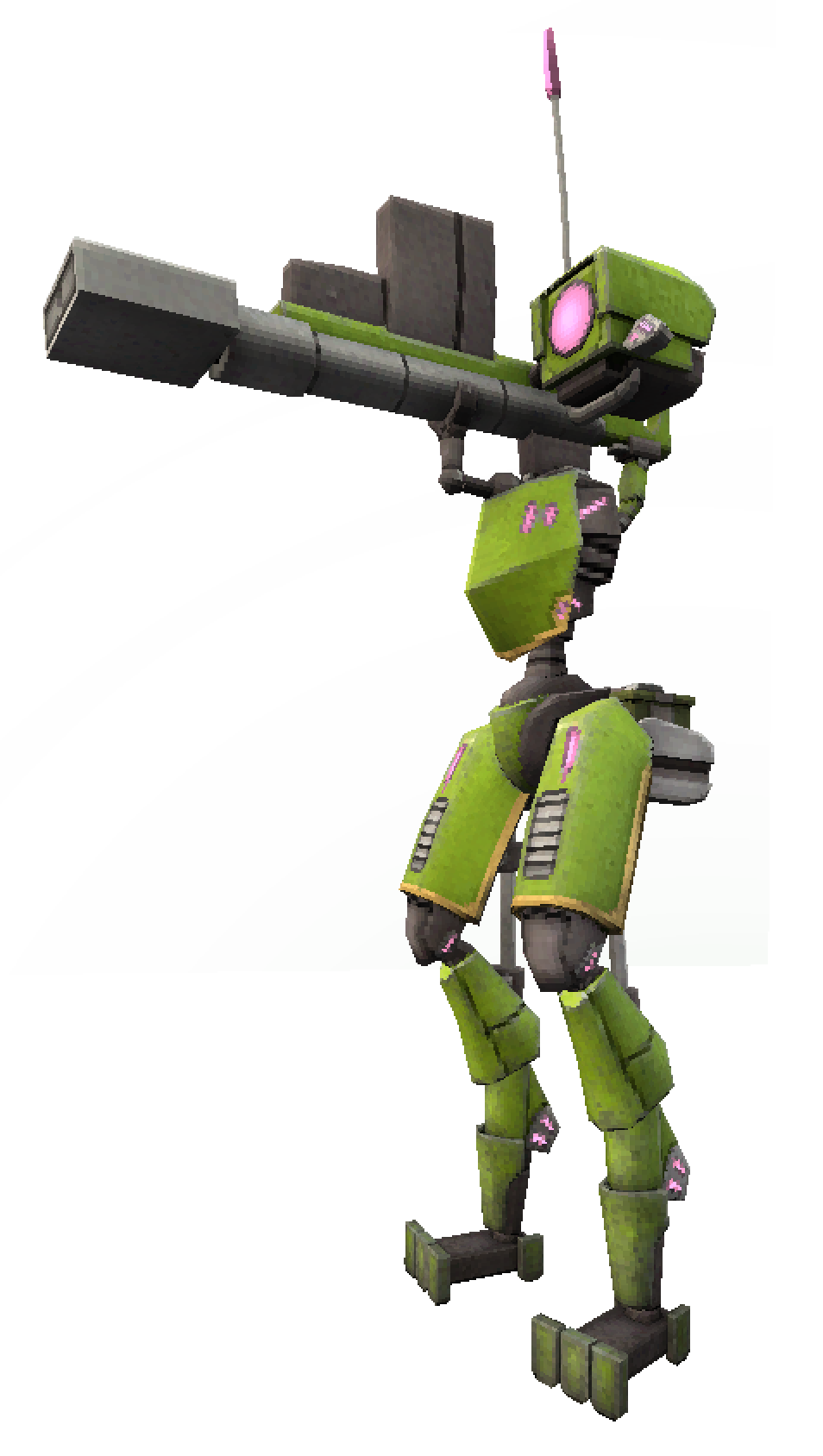 Sentries are humanoid-esque robots lacking arms. The plating of their body is green, with their knee joints and feet being a metallic grey. Their upper body consists solely of the barrel of a sniper rifle, with an antenna protruding from the back of it. To the right of the barrel is a small camera with pink lens, most likely the Sentry's eye. A small ammo box is attached to the back of Sentry's hip.