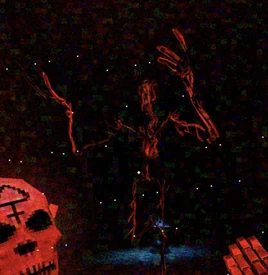 Upon picking up the Red Skull, Something Wicked will become significantly more aggressive, leaning forward and rushing towards the player rather than slowly walking upright. During this "Enraged" state, he always knows the location of the player and will constantly pursue them until they either die or the Red Skull is placed on either red podium(will revert to normal state if placed on the original podium)